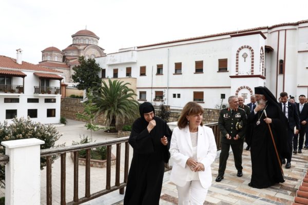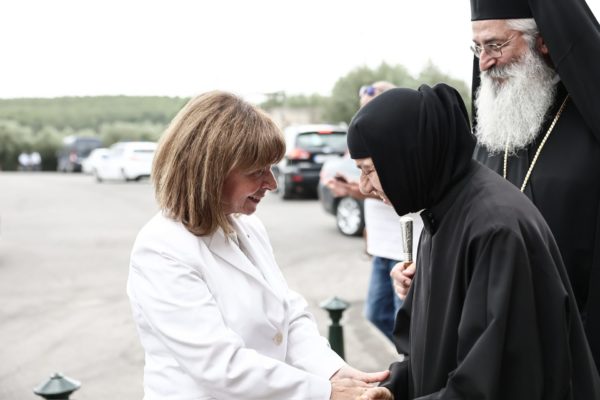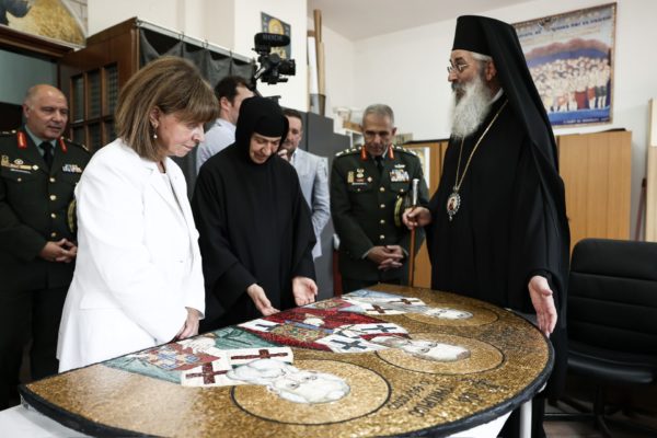 Η κ. Σακελλαροπούλου ξεναγήθηκε στους χώρους της Μονής από την ηγουμένη, τη γερόντισσα Μακρίνα, και στα εργαστήρια αγιογραφίας, κεντήματος, ψηδιδωτών και αμφίων.