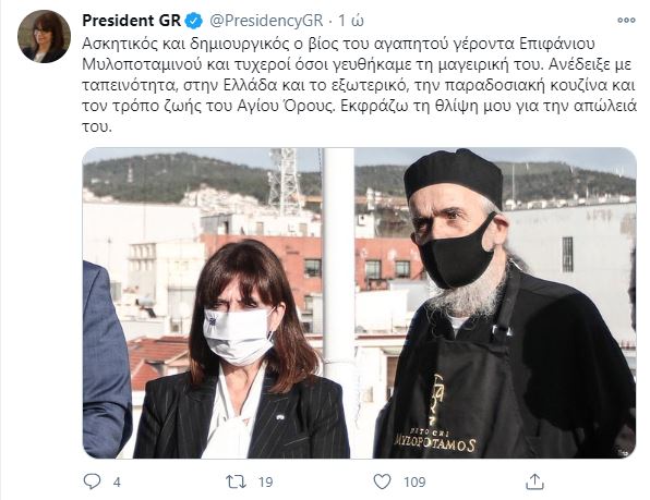 Τη θλίψη της για την απώλεια του γέροντα Επιφάνιου Μυλοποταμινού εξέφρασε η Πρόεδρος της Δημοκρατίας Κατερίνα Σακελλαροπούλου με ανάρτησή της στο Twitter. Όπως επισημαίνει: « Ασκητικός και δημιουργικός ο βίος του αγαπητού γέροντα Επιφάνιου Μυλοποταμινού και τυχεροί όσοι γευθήκαμε τη μαγειρική του. Ανέδειξε με ταπεινότητα, στην Ελλάδα και το εξωτερικό, την παραδοσιακή κουζίνα και τον τρόπο ζωής του Αγίου Όρους. Εκφράζω τη θλίψη μου για την απώλειά του».