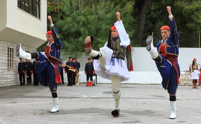 Τον θερινό χακί “ντουλαμά” – Στολή Βαλκανικών Πολέμων. Φέρεται καθημερινά από τους Εύζωνες κατά τη θερινή περίοδο.