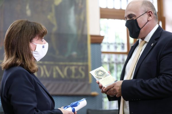 Αμέσως μετά, σε ειδική τελετή που πραγματοποιήθηκε στο Δημαρχείο της πόλης, η Πρόεδρος της Δημοκρατίας Κατερίνα Σακελλαροπούλου ανακηρύχθηκε επίτιμη δημότης Ναυπάκτου. Ακολουθεί η αντιφώνηση της Προέδρου της Δημοκρατίας: