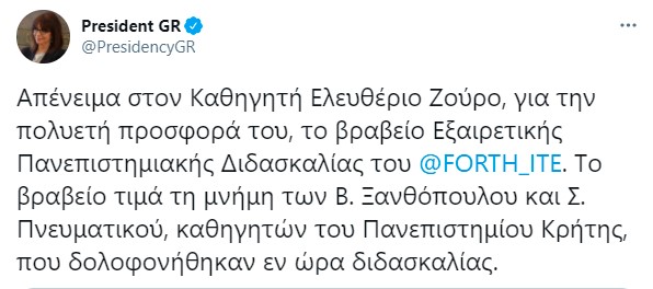 17/02/2021 17/02/2021 Το βραβείο Εξαιρετικής Πανεπιστημιακής Διδασκαλίας του Ιδρύματος Τεχνολογίας και Έρευνας απένειμε η Πρόεδρος της Δημοκρατίας κα. Αικατερίνη Σακελλαροπούλου στον Καθηγητή Ελευθέριο Ζούρο. Το βραβείο του δόθηκε, όπως αναφέρει η ανάρτηση της Προέδρου, για την πολυετή προσφορά του, ενώ, το βραβείο τιμά τη μνήμη των καθηγητών του Πανεπιστημίου Κρήτης που δολοφονήθηκαν εν ώρα διδασκαλίας, του Β....