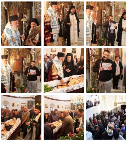 Στην εξόδιο ομιλία του, ο Σεβασμιώτατος κ. Δωρόθεος Β’, καταφανώς συγκινημένος αναφέρθηκε στον εκδημήσαντα Ηγούμενο με λόγους καρδιακούς και αδελφικούς, χαρακτηρίζοντάς τον «αγαπητό και σεβαστό αδελφό» και «δευτεροκτίτορα της Μονής», αφού η 46χρονη κόπιώδης Ηγουμενία του κατέστη κομβική για την ανακαίνιση και ανασυγκρότηση της Ιεράς Μονής του Μεγαλοχαρου Ταξιάρχη Μιχαήλ, η οποία φυλάσσει την εφέστιο εικόνα του.