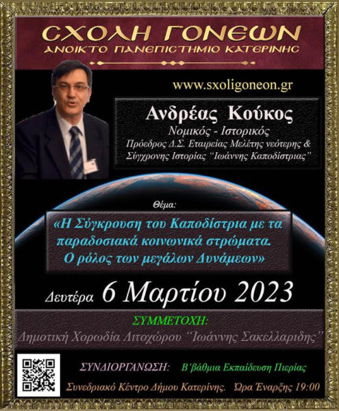 Η «σύγκρουση του Καποδίστρια με τα παραδοσιακά κοινωνικά στρώματα – Ο ρόλος των Μεγάλων Δυνάμεων» θα είναι το θέμα της επόμενης εκδήλωσης την Δευτέρα 6 Μαρτίου 2023 στις 19:00 με επίσημο ομιλητή και καλεσμένο της Σχολής Γονέων – Ανοικτό Πανεπιστήμιο Κατερίνης τον Καθηγητή Νεότερης Ιστορίας – Νομικό & Πρόεδρο του Δ.Σ. της Ε.ΜΕ.Ν.Σ.Ι. (Εταιρείας Μελέτης Νεότερης & Σύγχρονης Ιστορίας «Ιωάννης Καποδίστριας) κ. Ανδρέα Κούκο.