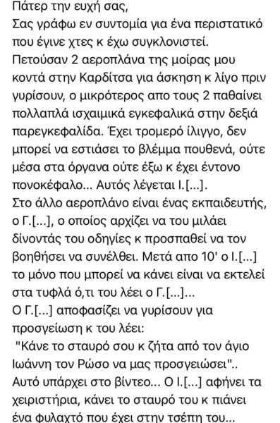 Το παρακάτω μήνυμα εστάλη σε ιερέα της Μητρόπολης Δημητριάδος από πιλότο της 111 Π.Μ της Νέας Αγχιάλου που έζησε το περιστατικό: