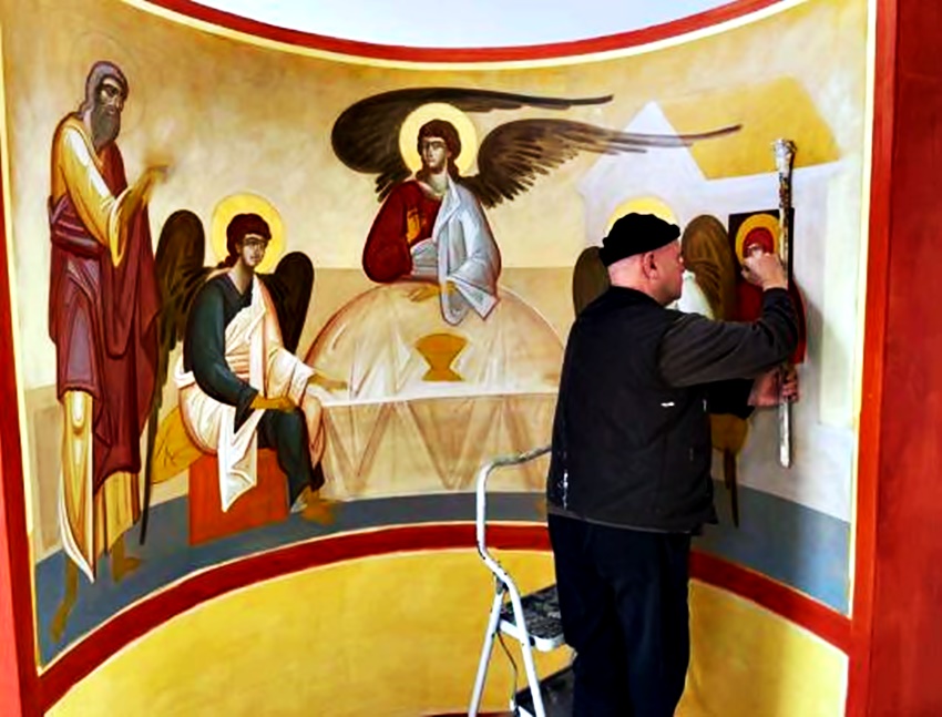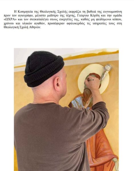 Η συνάντηση του Αν. Καθηγητή Χρήστου Καραγιάννη με τον εγνωσμένης αξίας αγιογράφο και πρώην μέλος ΔΕΠ του Τμ. Θεολογίας, κ. Γεώργιο Κόρδη, στις 31 Αυγούστου 2020, παραμονή της ανάληψης των καθηκόντων του νέου Κοσμήτορα της Θεολογικής Σχολής, είχε ως αποτέλεσμα την αποδοχή εκ μέρους του επικεφαλής της καλλιτεχνικής ομάδας «ΩΧΡΑ» της πρότασης για αγιογράφηση περίοπτων σημείων της Σχολής, ούτως ώστε η τελευταία να αποκτήσει το χαρακτήρα και την καλαισθησία, που της αρμόζει.