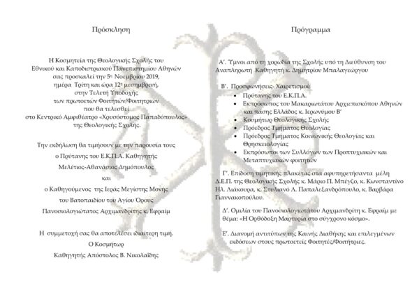 Η Κοσμητεία της Θεολογικής Σχολής του Εθνικού και Καποδιστριακού Πανεπιστημίου Αθηνών θα πραγματοποιήσει την καθιερωμένη τελετή υποδοχής των πρωτοετών φοιτητών και των δύο Τμημάτων της Θεολογικής Σχολής για το ακαδημαϊκό έτος 2019-2020, την Τρίτη 5 Νοεμβρίου 2019 και ώρα 12:00 στο Κεντρικό Αμφιθέατρο “Χρυσόστομος Παπαδόπουλος” της Σχολής.