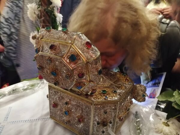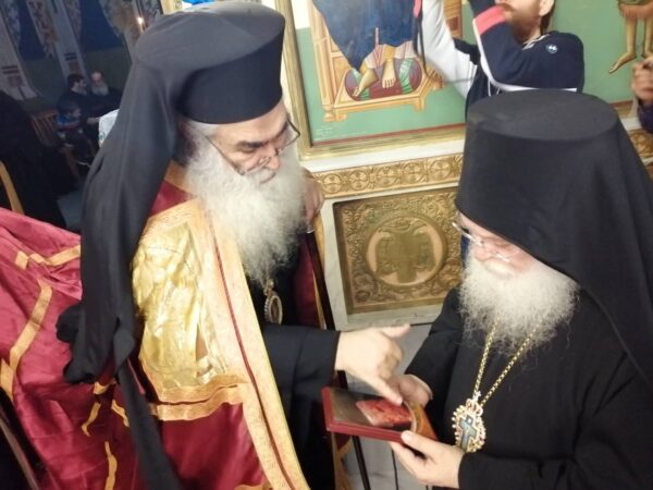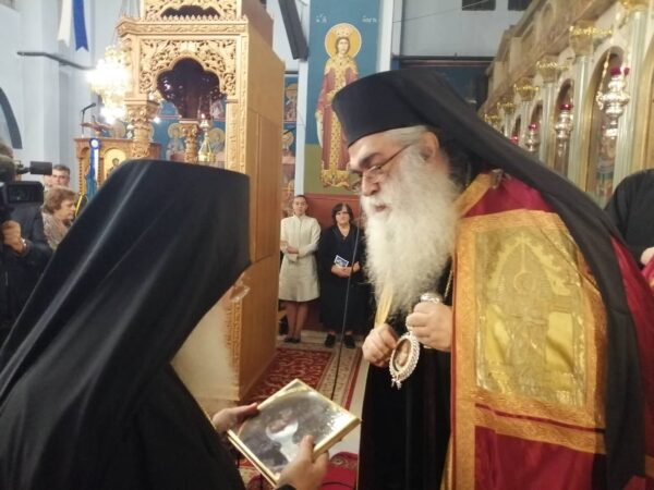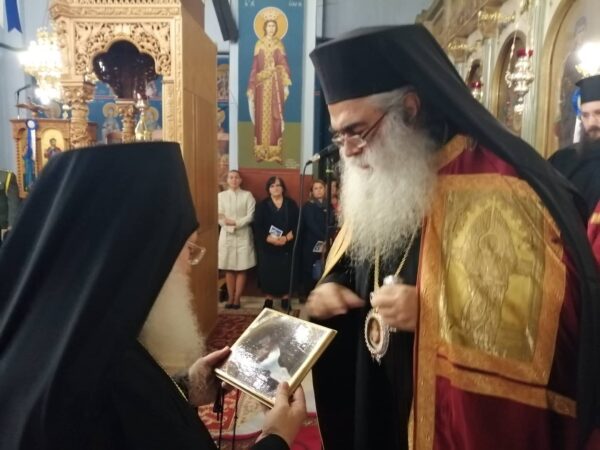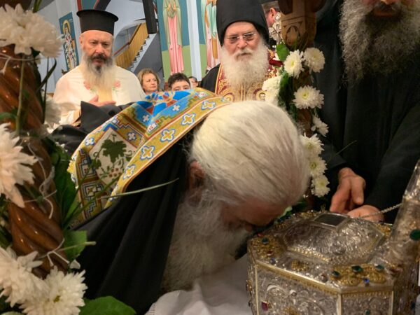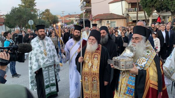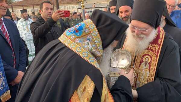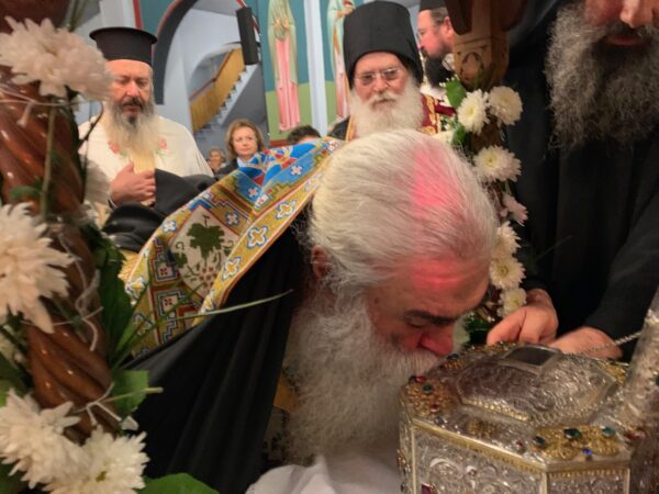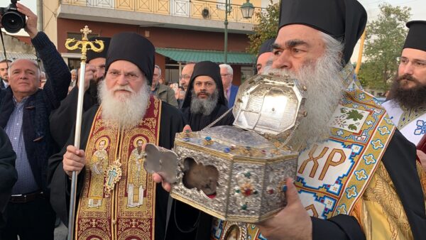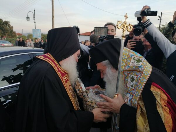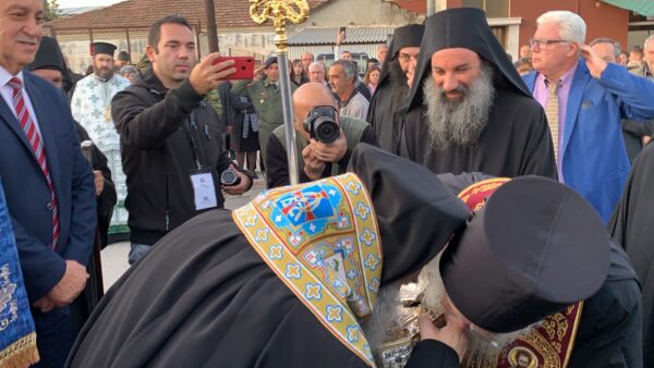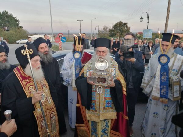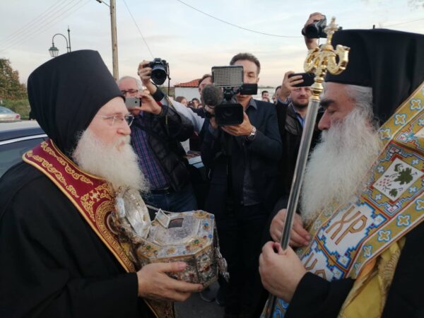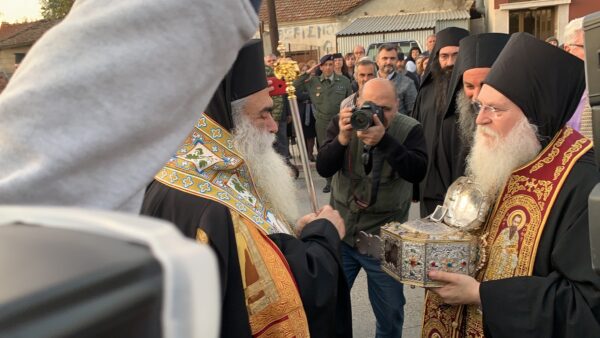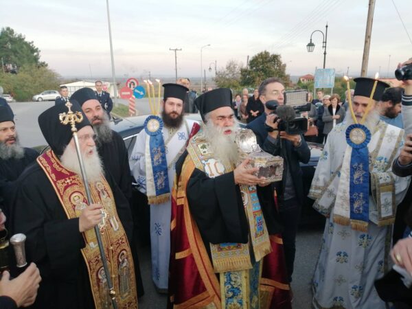 Υποδοχή της Τιμίας Κάρας του αγ. Ιωάννου του Χρυσοστόμου στον ΙΝ. Αγ. Γεωργίου στην ακριτική κωμόπολη του Ευρωπού στην Ιερά Μητρόπολη Γουμενίσσης, κατά την 15η Νοεμβρίου 2019. Το ιερό θησαύρισμα προσεκόμισε ο Αρχιμ. π. Εφραίμ, Καθηγούμενος της ΙΜ.Μ. Βατοπαιδίου Αγίου Όρους και παρέλαβε ο Σεβ. Μητροπολίτης Γουμενίσσης, Αξιουπόλεως και Πολυκάστρου, κ. Δημήτριος.