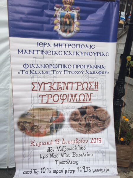 Γιά μία ἀκόμη φορά οἱ Τριπολίτες ἀνταποκρίθηκαν καί φέτος στό κάλεσμα τῆςἹερᾶς Μητροπόλεως Μαντινείας καί Κυνουρίας καί προσέφεραν τήν Κυριακή 15η Δεκεμβρίου 2019 μεγάλη ποσότητα τροφίμων· ὅπως γάλα, ψωμί, πατάτες, λάδι καί πολλά ἄλλα εἴδη διατροφῆς καί ὑγιεινῆς, στό Φιλανθρωπικό Πρόγραμμα τῆς Ἱερᾶς Μητροπόλεώς μας «Τό Καλάθι τοῦ Πτωχοῦ Ἀδελφοῦ.