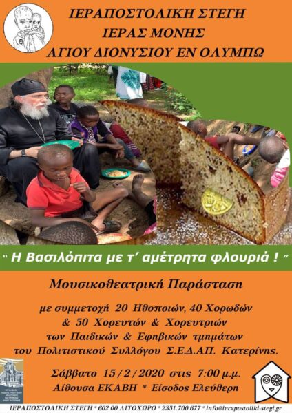 Το πρόγραμμα περιλαμβάνει μουσικοθεατρική παράσταση, με τίτλο “Η Βασιλόπιτα με τ’αμέτρητα φλουριά!”, με τη συμμετοχή 20 ηθοποιών, 40 χορωδών και 50 χορευτών και χορευτριών των παιδικών και εφηβικών τμημάτων του Πολιτιστικού Συλλόγου Σ.Ε.Δ.Α.Π. Κατερίνης.