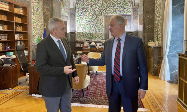 Τέλος, τον ευχαρίστησε για την πολύτιμη συμβολή του στην έκδοση του τόμου για τους ναούς της Αγίας Σοφίας ανά τον κόσμο, αλλά και του αφιερωματικού τόμου στη διορθόδοξη παρουσία του Αγίου Όρους στα χρόνια της οθωμανικής κυριαρχίας (1430-1912), που τυπώνονται με υψηλού επιπέδου προδιαγραφές στο τυπογραφείο της Βουλής.