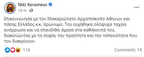 Ταχεία ανάρρωση ευχήθηκε στον Μακαριώτατο Αρχιεπίσκοπο Αθηνών και πάσης Ελλάδος κ.κ. Ιερώνυμο η υπουργός Παιδείας και Θρησκευμάτων, Νίκη Κεραμέως. Με μια ανάρτηση στο facebook, η ίδια έγραψε: