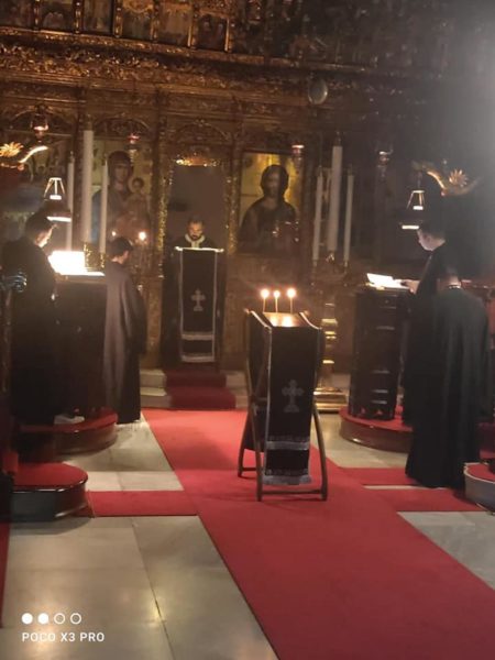 Τα τροπάρια της Ακολουθίας του πρώτου Νυμφίου (Όρθρος Μεγάλης Δευτέρα) ακούστηκαν χθες το βράδυ στο ναΰδριο της Θεολογικής Σχολής της Χάλκης όπου τελέστηκε η Ακολουθία του Νυμφίου χροστατούτνος του Θεοφιλεστάτου Καθηγουμένου, Επισκόπου Αραβισσού κ. Κασσιανού.