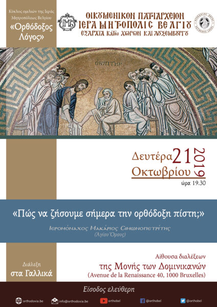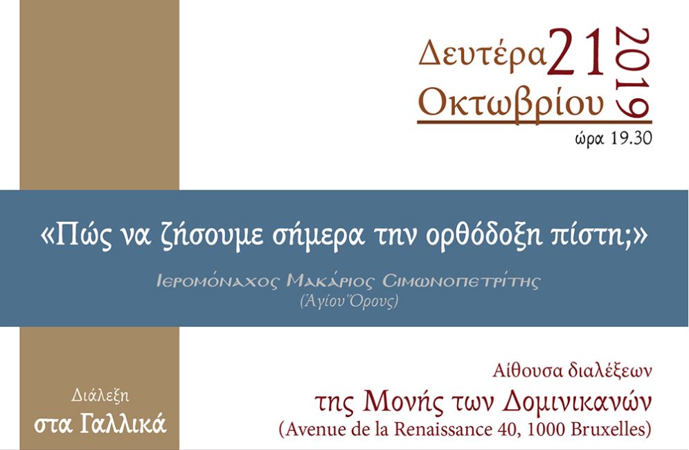 “Πως να ζήσουμε σήμερα την ορθόδοξη πίστη;” – Διάλεξη στα γαλλικά – Εκ μέρους του Ιερομονάχου Μακαρίου Σιμωνοπετρίτου στην Αίθουσα Διαλέξεων της Μονής των Δομινικανών (Avenue de la Renaissance 40, 1000 Bruxelles), κατά τη Δευτέρα 21 Οκτωβρίου 2019 και ώρα 19.30 της εσπέρας.