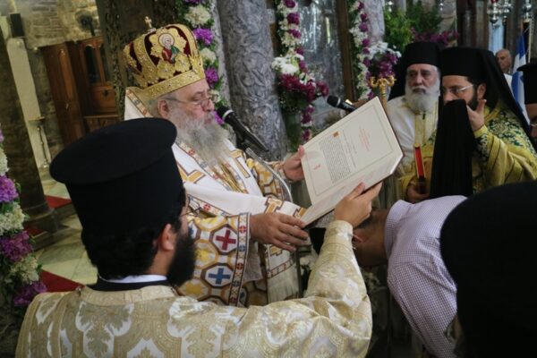 Προ της Απολύσεως, ο Σεβασμιώτατος τέλεσε την Χειροθεσία εις Αναγνώστη του κ. Δημητρίου Καραπαναγιώτη, Υποπυραγού και Προϊσταμένου του Πυροσβεστικού Κλιμακίου Πάρου. Εν συνεχεία προέστη της Ιεράς Λιτανεύσεως των Ιερών Εικόνων και των Σεπτών Λειψάνων της Οσίας.
