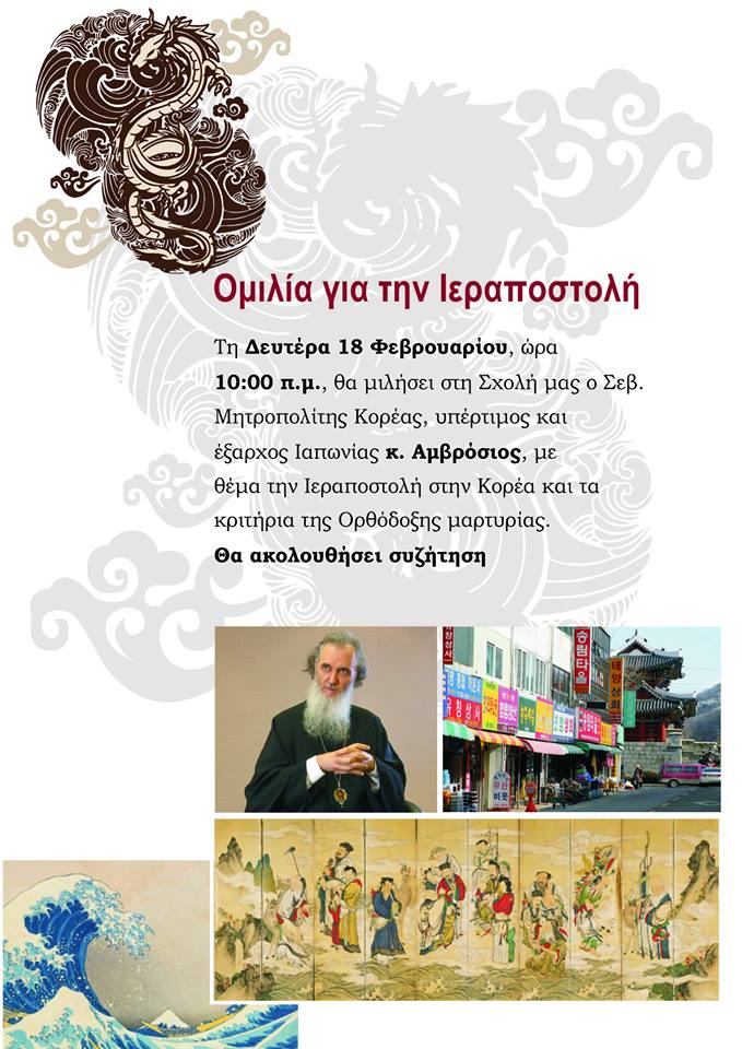 Ομιλία για την Ιεραποστολή θα πραγματοποιηθεί τη Δευτέρα 18 Φεβρουαρίου στην Ανωτάτη Εκκλησιαστική Ακαδημία Αθηνών. Ομιλητής θα είναι ο Σεβ. Μητροπολίτης Κορέας κ. Αμβρόσιος.