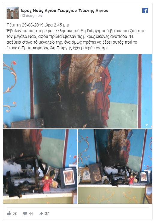 Έβαλαν φωτιά στο μικρό εκκλησάκι τού Άη Γιώργη πού βρίσκεται έξω από τόν μεγάλο Ναό, αφού πρώτα έβαλαν τίς μικρές εικόνες ανάποδα. Ή ασέβεια σ’όλο τό μεγαλείο της, ένα όμως πρέπει να ξέρει αυτός πού το έκανε ό Τροπαιοφόρος Άη Γιώργης έχει μακρύ κοντάρι.»