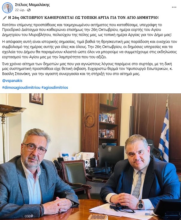 Κατόπιν επίμονης προσπάθειας και τεκμηριωμένου αιτήματος που καταθέσαμε, υπεγράφη το Προεδρικό Διάταγμα που καθιερώνει επισήμως την 26η Οκτωβρίου, ημέρα εορτής του Αγίου Δημητρίου του Μυροβλήτου, πολιούχου της πόλης μας, ως τοπική ημέρα Αργίας για τον Δήμο μας!