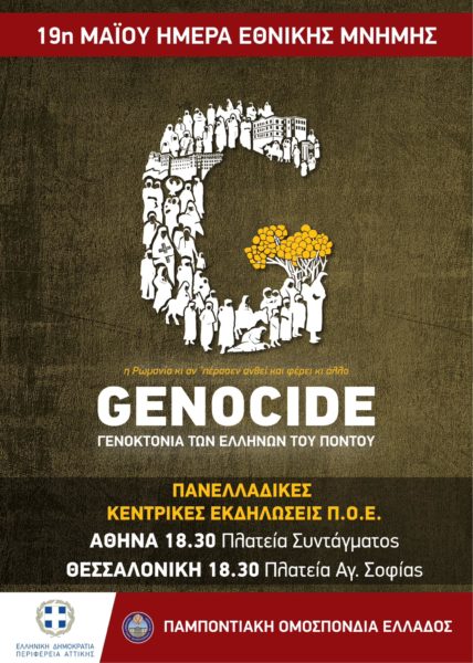 “Η 19η Μαϊου αποτελεί την κορύφωση των δράσεων υπέρ των επιδιώξεών μας για τη διεθνή αναγνώριση της Γενοκτονίας των Ελλήνων της Ανατολής. Απώτερος σκοπός του αγώνα μας για Διεθνή αναγνώριση της Γενοκτονίας, τίθεται η πρόληψη και η αποτροπή παρόμοιων εγκλημάτων, τα οποία, δυστυχώς, εξακολουθούν να ταλανίζουν την ανθρωπότητα”, αναφέρει στο μήνυμα της για τις φετινές εκδηλώσεις η Παμποντιακή Ομοσπονδία Ελλάδος.