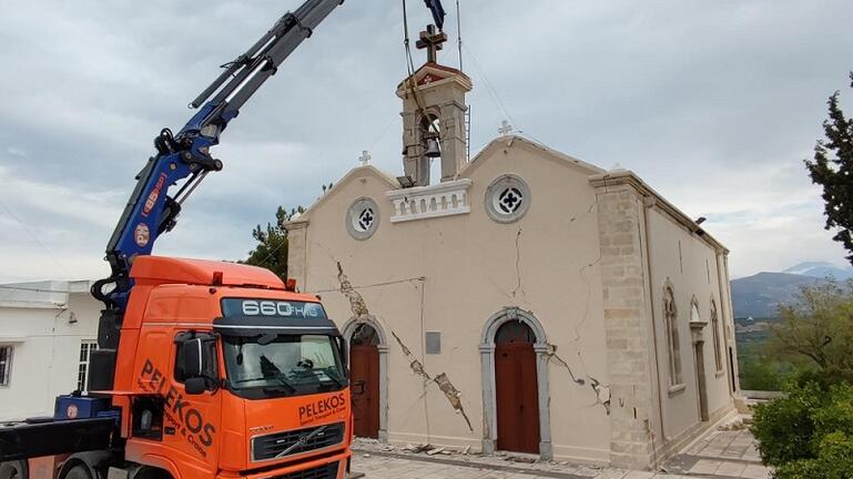 Στην απομάκρυνση του 110 ετών καμπαναριού στο “λαβωμένο” από τον σεισμό του Σεπτεμβρίου εκκλησάκι του Αγίου Γεωργίου στο Ίνι Ηρακλείου προχώρησαν για λόγους ασφαλείας οι αρχές.
