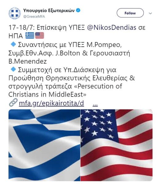 Ο Υπουργός Εξωτερικών, Νίκος Δένδιας, μεταβαίνει στις Ηνωμένες Πολιτείες της Αμερικής, όπου συναντάνται, κατά την Τετάρτη 17 Ιουλίου 2019, με τον Αμερικανό ομόλογό του, Mike Pompeo, με τον οποίο θα συζητήσουν ζητήματα διμερούς, περιφερειακού και διεθνούς ενδιαφέροντος.