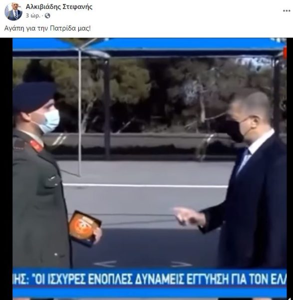 «Αγάπη για την Πατρίδα μας!» με αυτόν τον τίτλο ο Υφυπουργός Εθνικής Άμυνας Αλκιβιάδης Στεφανή θέλησε με ανάρτησή του στο facebook να αναδείξει την ενέργεια Δόκιμου Εφέδρου Αξιωματικού που παραδίδοντας την Ελληνική σημαία έσκυψε και τη φίλησε.