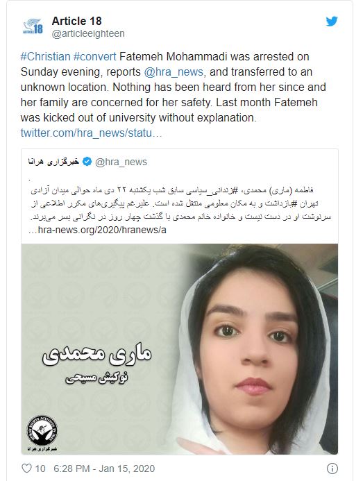 Νωρίτερα φέτος, η Φατιμέ έγραψε μια ανοιχτή επιστολή προς τον υπουργό πληροφοριών του Ιράν, κατηγορώντας τον ότι παραβίασε το σύνταγμα με στόχο τους Χριστιανούς. Τόνισε επίσης, ότι οι Χριστιανοί εμποδίζονται να “μιλάνε για τις πεποιθήσεις τους με τους συνομηλίκους τους”, ενώ οι μουσουλμάνοι μπορούν ελεύθερα να προβαίνουν σε «προπαγάνδα» σε σχολεία, πανεπιστήμια, τζαμιά και ιερά