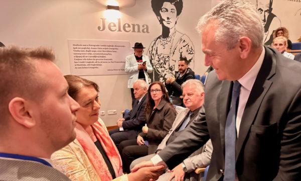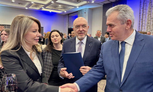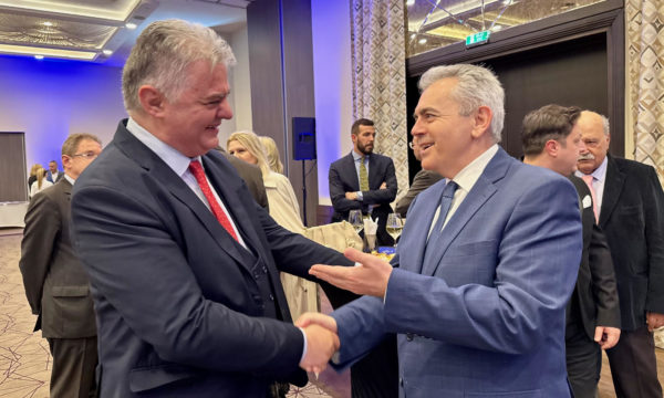 Ο Μάξιμος Χαρακόπουλος στην εκδήλωση της ελληνικής πρεσβείας στην Ποντγκόριτσα με τον υφυπουργό Εξωτερικών, Κώστα Φραγκογιάννη και την Διοικήτρια της Κεντρικής Τράπεζας του Μαυροβουνίου, ΙρένεΡάντοβιτς
