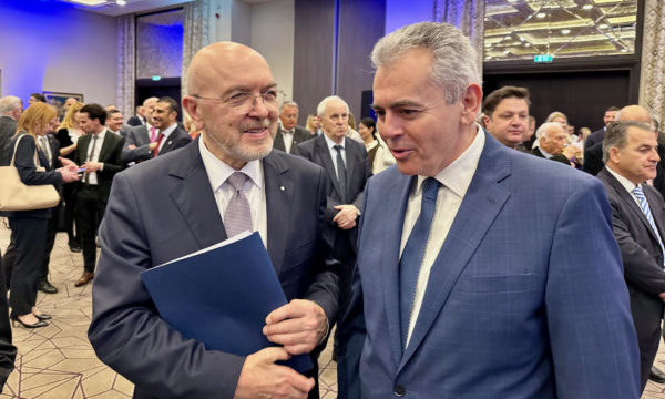 Ο Μάξιμος Χαρακόπουλος στην εκδήλωση της ελληνικής πρεσβείας στην Ποντγκόριτσα με τον υφυπουργό Εξωτερικών, Κώστα Φραγκογιάννη και την Διοικήτρια της Κεντρικής Τράπεζας του Μαυροβουνίου, ΙρένεΡάντοβιτς