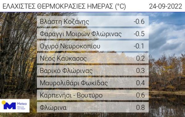 Σύμφωνα με το δίκτυο αυτόματων μετεωρολογικών σταθμών του Εθνικού Αστεροσκοπείου Αθηνών / meteo.gr, χαμηλές ελάχιστες θερμοκρασίες σημειώθηκαν το πρωί του Σαββάτου 24/09, με τον υδράργυρο να πέφτει τοπικά κάτω από τους 0 βαθμούς Κελσίου.