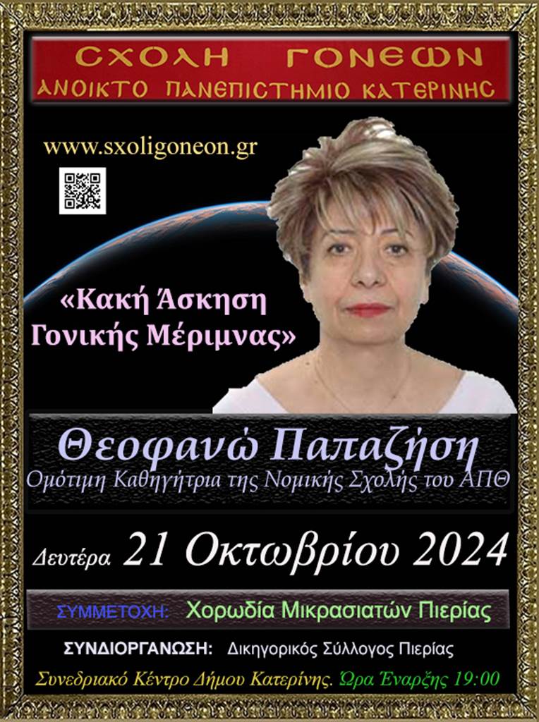 «Κακή Άσκηση Γονικής Μέριμνας» είναι το θέμα της επόμενης εκδήλωσης της Σχολής Γονέων – Ανοικτό Πανεπιστήμιο Κατερίνης την Δευτέρα 21 Οκτωβρίου. Επίσημη καλεσμένη και ομιλήτρια είναι η ομότιμη καθηγήτρια Νομικής Α.Π.Θ. κ. Θεοφανώ Παπαζήση.