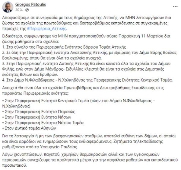 «Αποφασίζουμε σε συνεργασία με τους Δημάρχους της Αττικής, να ΜΗΝ λειτουργήσουν δια ζώσης τα σχολεία της πρωτοβάθμιας και δευτεροβάθμιας εκπαίδευσης σε συγκεκριμένες περιοχές της Περιφέρειας Αττικής.