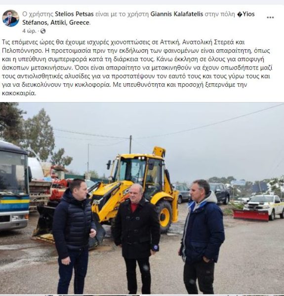 Τις επόμενες ώρες θα έχουμε ισχυρές χιονοπτώσεις σε Αττική, Ανατολική Στερεά και Πελοπόννησο. Η προετοιμασία πριν την εκδήλωση των φαινομένων είναι απαραίτητη, όπως και η υπεύθυνη συμπεριφορά κατά τη διάρκεια τους. Κάνω έκκληση σε όλους για αποφυγή άσκοπων μετακινήσεων. Όσοι είναι απαραίτητο να μετακινηθούν να έχουν οπωσδήποτε μαζί τους αντιολισθητικές αλυσίδες για να προστατέψουν τον εαυτό τους και τους γύρω τους και για να διευκολύνουν την κυκλοφορία. Με υπευθυνότητα και προσοχή ξεπερνάμε την κακοκαιρία.
