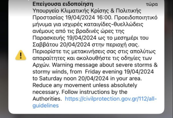Συγκεκριμένα, στο μήνυμα του 112 ενημερώνεται ο πληθυσμός ότι πρόκειται για “Προειδοποιητικό μήνυμα για ισχυρές καταιγίδες -θυελλώδεις ανέμους από τις βραδινές ώρες της Παρασκευής 19/04/2024 ως το μεσημέρι του Σαββάτου 20/04/2024 στην περιοχή σας.Περιορίστε τις μετακινήσεις σας στις απολύτως απαραίτητες και ακολουθείστε τις οδηγίες των Αρχών”.