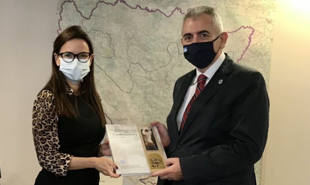 Στη συνάντηση που πραγματοποιήθηκε στην έδρα της πρεσβείας, ο κ. Χαρακόπουλος, που συνοδεύονταν από τον σύμβουλο της ΔΣΟ δρ Κώστα Μυγδάλη, προσέφερε στην κ. Ristović Krtić τον τόμο που εξέδωσε η ΔΣΟ με βραβευμένα έργα διεθνούς διαγωνισμού με θέμα την “Ανάσταση του Χριστού”.