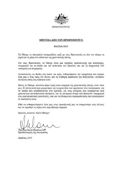 Και με τις ευχές «Χριστός Ανέστη! Καλό Πάσχα» καταλήγει το πασχαλινό μήνυμα του Αυστραλού πρωθυπουργού.