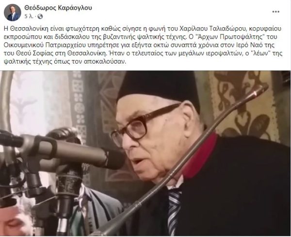 Στην εκδημία του Άρχοντα Πρωτοψάλτη της Μεγάλης του Χριστού Εκκλησίας αναφέρθηκε σε ανάρτησή του ο πρώην υφυπουργός Εσωτερικών (Μακεδονίας – Θράκης) κ. Θεόδωρος Καράογλου. Όπως σημειώνει ο κ. Καράογλου η Θεσσαλονίκη είναι φτωχότερη καθώς σίγησε η φωνή ενός εκ των τελευταίων ιεροψαλτών.