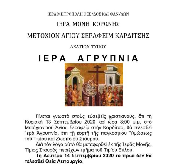 Την Κυριακή 13 Σεπτεμβρίου 2020 και ώρα 8:00 μ.μ. στο Μετόχι του Αγίου Σεραφείμ στην Καρδίτσα, θα τελεσθεί Ιερά Αγρυπνία, επί τη εορτή της παγκοσμίου Υψώσεως του Τιμίου και Ζωοποιού Σταυρού.