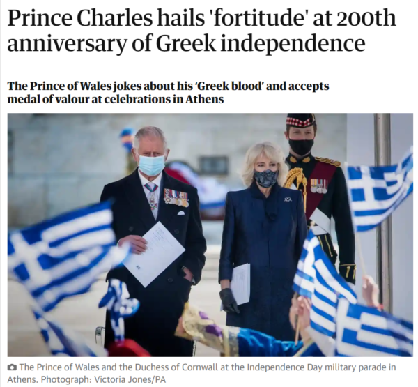 Δύο χρόνια μετά, το 2021 όταν επισκέφθηκε την Ελλάδα, αυτή τη φορά για να παραστεί στις εκδηλώσεις για τα 200 χρόνια από την Επανάσταση του 1821, στην αντιφώνησή του στο δείπνο που παρέθεσε προς τιμή των ξένων ηγετών, η ΠτΔ Κατερίνα Σακελλαροπούλου, αναφέρθηκε στους ιδιαίτερους δεσμούς, που τον συνδέουν με την Ελλάδα και τους Έλληνες. Υπενθύμισε δε ότι για εκείνον η Ελλάδα έχει ιδιαίτερη θέση στην καρδιά του, λέγοντας ότι είναι η πατρίδα των προγόνων του. «…Όπως και το 1821, η Ελλάδα μπορεί να υπολογίζει στους φίλους της στο Ηνωμένο Βασίλειο», προσθέτοντας ότι «οι δεσμοί μεταξύ μας είναι ισχυροί και ζωτικοί και κάνουν τεράστια διαφορά στην κοινή μας ευημερία και ασφάλεια. Όπως ακριβώς οι ιστορίες μας είναι στενά συνδεδεμένες μεταξύ τους, έτσι είναι και το μέλλον μας».