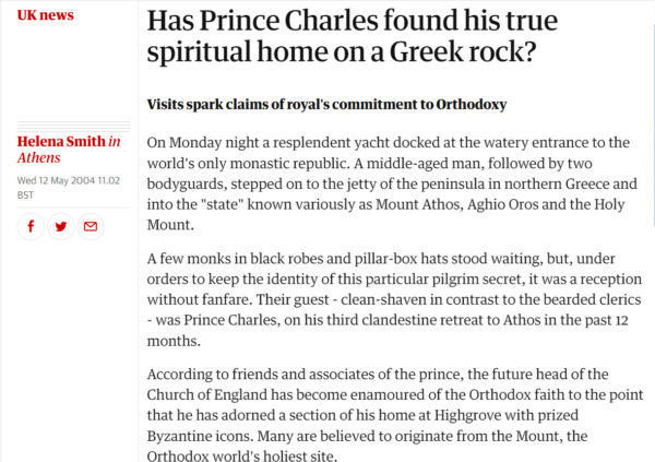 Το 2004 η εφημερίδα The Guardian είχε φιλοξενήσει δηλώσεις του Αρχιεπισκόπου Θυατείρων Γρηγόριου για τον Κάρολο ο οποίος είχε επισημάνει: «Αυτό που ξεχνούν οι άνθρωποι είναι ότι η Ορθοδοξία είναι στην οικογένειά του».