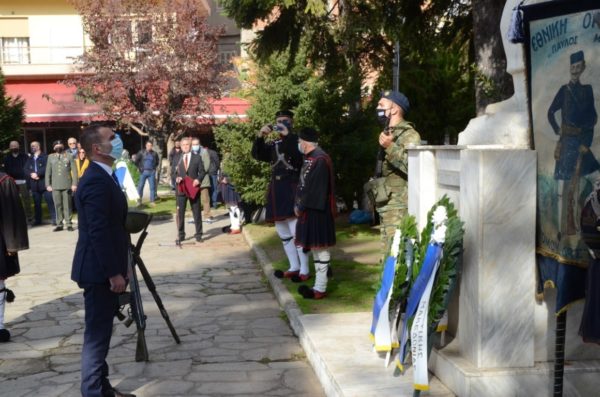 Στη συνέχεια, οι εκπρόσωποι των τοπικών Αρχών μετέβησαν στο Μνημείο των Ηρώων, στην Πλατεία Μακεδονομάχων, όπου τελέστηκε Επιμνημόσυνη Δέηση και κατάθεση στεφάνων.