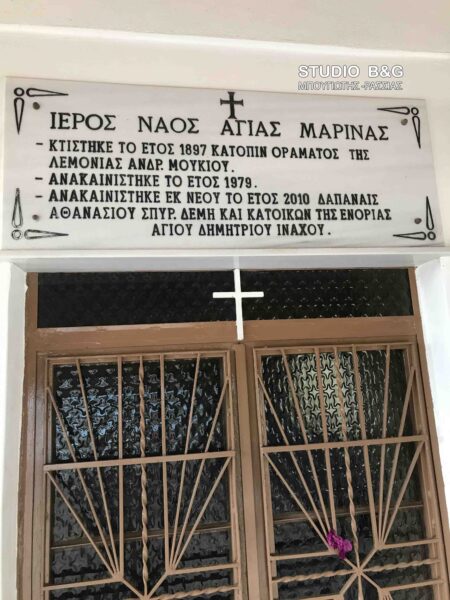 Άγνωστοι δράστες κατέστρεψαν εικονοστάσι στον περίβολο του Ιερού Ναού Αγίας Μαρίνας στον Ίναχο Αργολίδας, την Τρίτη 14 Ιουλίου 2020. Το προσκυνητάρι της Αγίας Μαρίνας βρήκαν κατεστραμμένο ο εφημέριος του ναού πρωτοπρεσβύτερος π. Θεοδόσιος Μπονταίτης μαζί με τους επιτρόπους του ναού. Για τις εκτεταμένες ζημιές στο προσκυνητάρι της Αγίας ενημερώθηκε η ασφάλεια Άργους . Το εκκλησάκι γιορτάζει την Παρασκευή 17 Ιουλίου 2020.