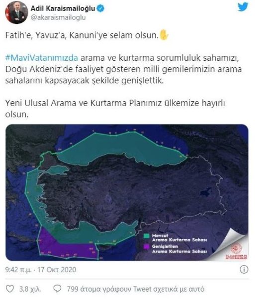 Τη σκυτάλη πήρε ο υπουργός Μεταφορών και Υποδομών Αντίλ Καραϊσμαΐνογλου. Με χάρτη που ανήρτησε στον λογαριασμό του στο Twitter o Υπουργός Μεταφορών ο οποίος υποστήριξε ότι η χώρα του επέκτεινε τις περιοχές έρευνας και διάσωσης «για να καλύπτει τις περιοχές στις οποίες πραγματοποιούν έρευνες τα πλοία μας στην ανατολική Μεσόγειο». Στην ανάρτησή του μάλιστα, ο Αντίλ Καραϊσμαΐνογλου, ‘στέλνει’ και χαιρετισματα στο Φατίχ, το Γιαβούζ και το Kanuni.