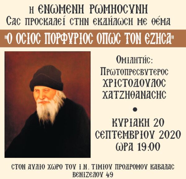 Η Ενωμένη Ρωμηοσύνη πραγματοποιεί εκδήλωση με θέμα” Όσιος Πορφύριος όπως τον έζησα”, κατά την Κυριακή 20 Σεπτεμβρίου 2020 ώρα 19:00 στον αύλειο χώρο του Ιερού Ναού Τιμίου Προδρόμου Καβάλας (Βενιζέλου 49) με ομιλητή τον πρωτοπρεσβύτερο Χριστόδουλο Χατζηθανάση, ο οποίος υπήρξε πνευματικό τέκνο του Οσίου Πορφυρίου.