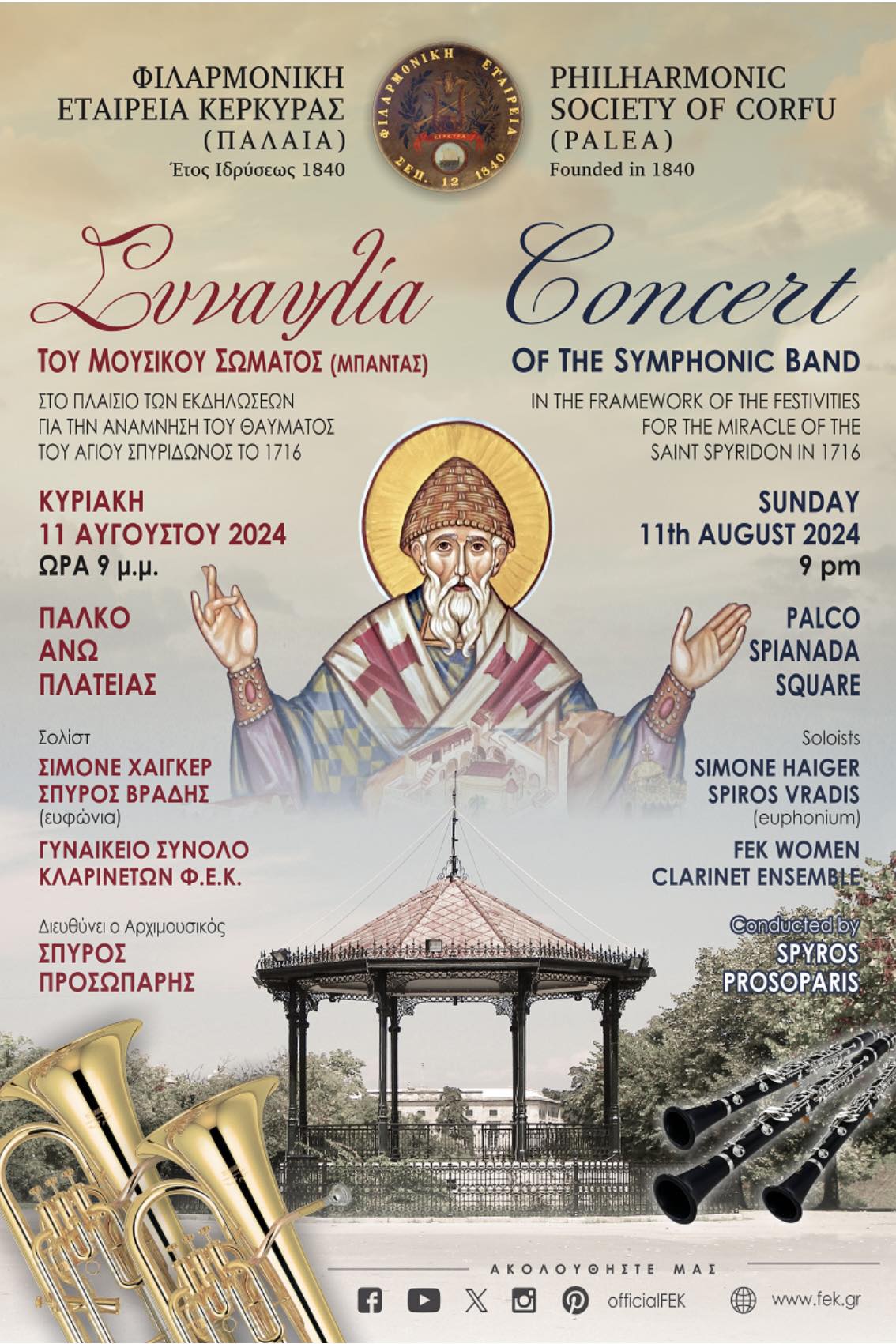 Πιστή στην παράδοση ανελλιπώς έως σήμερα, η μπάντα της Φιλαρμονικής Εταιρείας Κερκύρας θα παρουσιαστεί και φέτος στο πάλκο της Σπιανάδας στις 11 Αυγούστου ώρα 9 μ.μ., χαρίζοντας όμορφες μουσικές στιγμές στην καλοκαιρινή συναυλία στο πλαίσιο των εορτασμών για την ανάμνηση του θαύματος του Αγίου Σπυρίδωνος το 1716 και την συμβολή Του στην λύση της πολιορκίας της πόλης από τους Οθωμανούς.