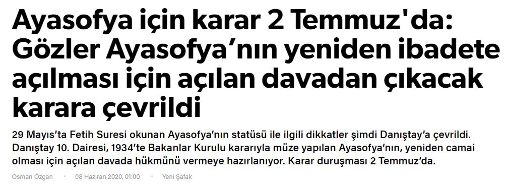 Δημοσίευμα της εφημερίδας YeniSafak με σημερινή ημερομηνία γράφει ότι στις 2 Ιουλίου αναμένεται να συζητηθεί στο Συμβούλιο της Επικρατείας της Τουρκίας προσφυγή για το καθεστώς της Αγίας Σοφίας,. Η προσφυγή τάσσεται κατά της απόφασης του 1934 για μετατροπή του ναού σε μουσείο, και ζητεί να αρχίσουν εκ νέου οι μουσουλμανικές τελετές.