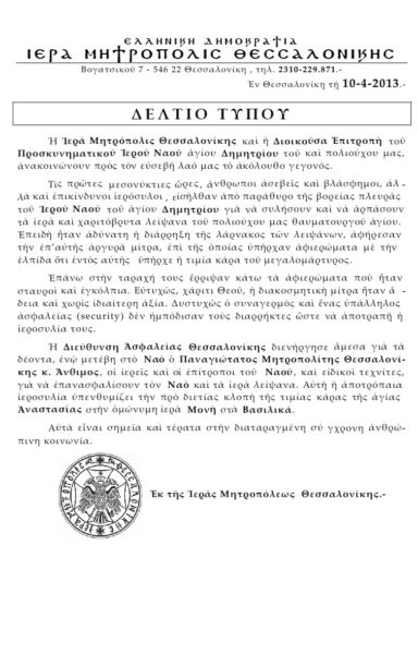 Λίγο λιγότερο από ένα χρόνο μετά, τον Απρίλιο του 2013, άγνωστοι διέρρηξαν την εκκλησία του Αγίου Δημητρίου στη Θεσσαλονίκη, παίρνοντας τάματα των πιστών και μία ασημένια μίτρα που ήταν τοποθετημένη πάνω στη λάρνακα των λειψάνων του Αγίου, την οποία δεν κατάφεραν ν’ ανοίξουν.