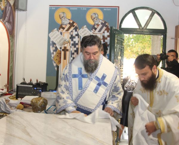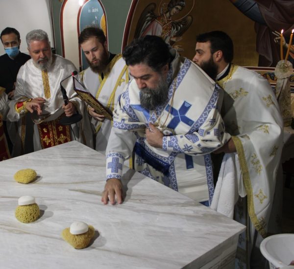 Προϊούσης της ιεράς ακολουθίας, ο Σεβ. κ. Θεολόγος ερμήνευε στους πιστούς τα τελούμενα και τον θεολογικό συμβολισμό τους. Μετά την τελετουργική ολοκλήρωση της εκπλύσεως δι’ ύδατος αγιασμένου και αρωμάτων, της μυρώσεως και της ενδύσεως διά του κατασαρκίου και των λοιπών ιερών αμφίων της αγίας Τραπέζης και του καθαγιασμού διά του αγίου Μύρου των ιερών αντιμηνσίων, εσυνεχίσθη η Αρχιερατική θ. Λειτουργία.