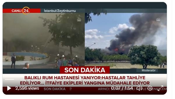 #SONDAKİKA Zeytinburnu’ndaki Balıklı Rum Hastanesi yanıyor. Hastaların tahliyesi ve itfaiye ekiplerinin yangına müdahalesi sürüyor. Son durumu 24 TV Muhabiri Esma Murat (@ESMAMURATT) aktarıyor. pic.twitter.com/wvCW03aSgb