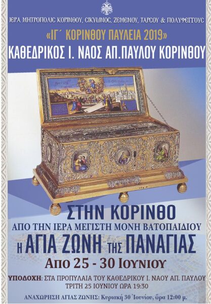 Εξαιρετική ευλογία για την Ι. Μητρόπολή Κορίνθου και για όλους τους ευλαβείς προσκυνητές των εορταστικών Εκκλησιαστικών Εκδηλώσεων των «ΙΓ΄ ΚΟΡΙΝΘΟΥ ΠΑΥΛΕΙΩΝ 2019» αποτελεί η έλευση της Αγίας Ζώνης της Θεοτόκου, η οποία φυλάσσεται στην Ιερά Μεγίστη Μονή Βατοπαιδίου, Αγίου Όρους.
