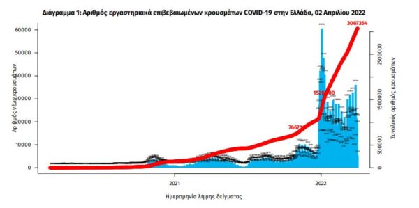 Τα νέα εργαστηριακά επιβεβαιωμένα κρούσματα της νόσου που καταγράφηκαν τις τελευταίες 24 ώρες είναι 15.823 , εκ των οποίων 2 εντοπίστηκαν κατόπιν ελέγχων στις πύλες εισόδου της χώρας. Ο συνολικός αριθμός των κρουσμάτων ανέρχεται σε 3.067.354 (ημερήσια μεταβολή +0.5%), εκ των οποίων 49.1% άνδρες. Με βάση τα επιβεβαιωμένα κρούσματα των τελευταίων 7 ημερών, 158 θεωρούνται σχετιζόμενα με ταξίδι από το εξωτερικό και 1.760 είναι σχετιζόμενα με ήδη γνωστό κρούσμα.